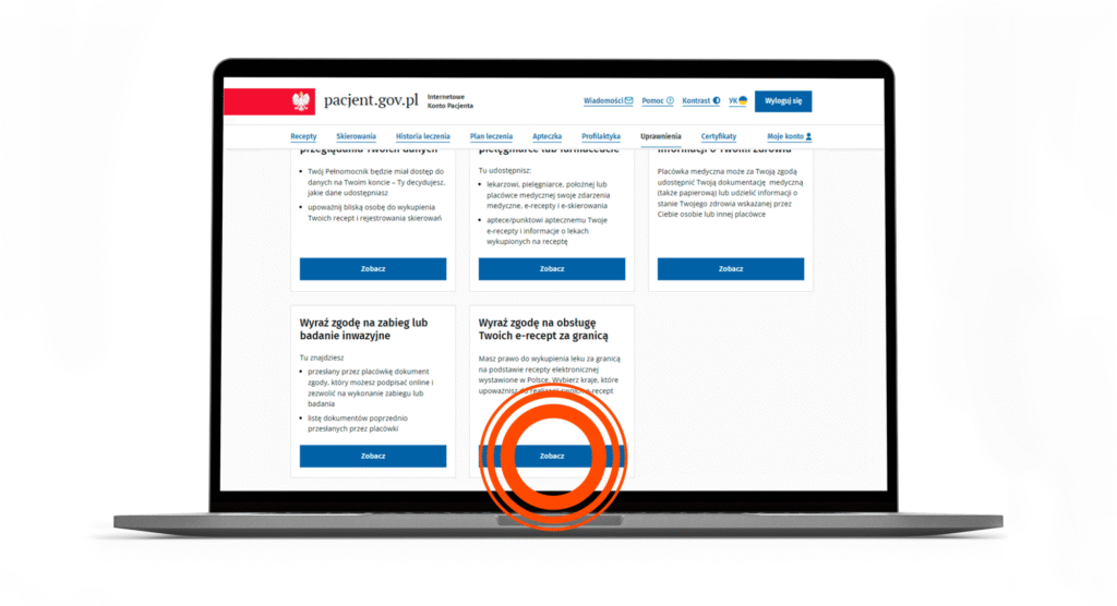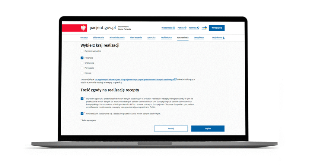 - Wybierz opcję „Wyraź zgodę na obsługę Twoich e-recept za granicą”.